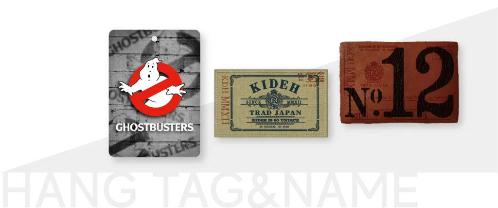 商品に必要な下げ札・織りネーム等の付属類のデザインです。商品に合わせた効果的なデザインをご提案を致します。